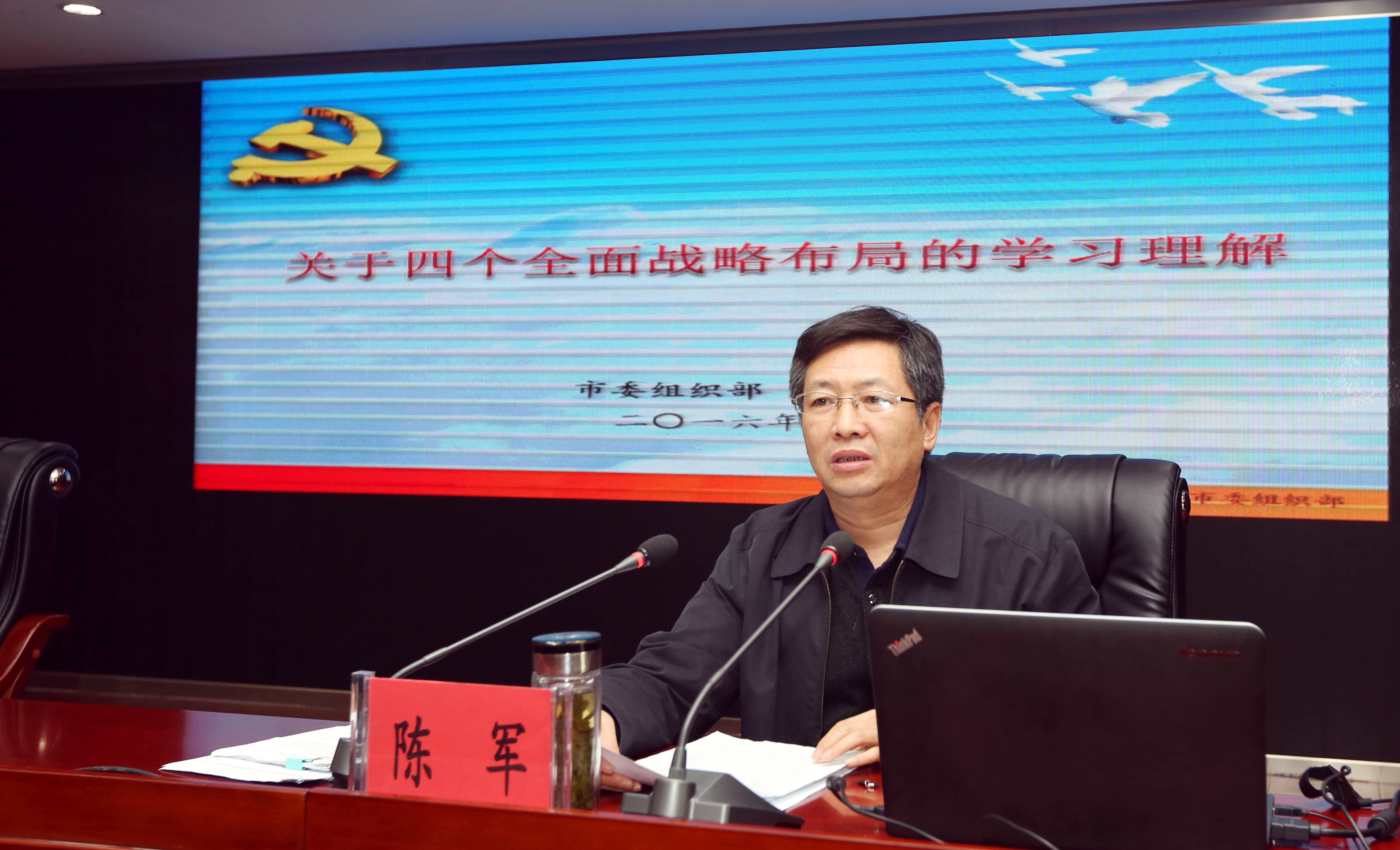 114日下午,集團公司黨委召開中心組學習(擴大)會,邀請市委組織部副部長、市委黨建辦主任、組織員辦公室主任陳軍就“四個全面”的學習和理解作專題輔導報告。集公司黨委書記、董事長楊龍主持會議,集團公司領導班子成員,各權屬單位領導班子成員、黨群有關部門負責人,集團總部全體管理人員參加會議。