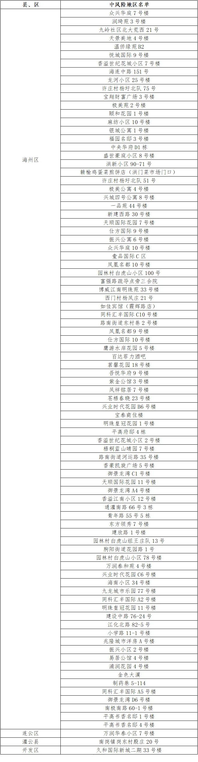根據國務院聯防聯控機制有關規定,經綜合評估研判,市指揮部決定,自發布之日起,將海州區浦潤花園4號樓、金色大漠、制藥巷5-114、同科匯豐國際A5號樓、御景龍灣D6號樓、南極南路60-1號樓、平高書香名邸1號樓、平高書香名邸4號樓調整為中風險地區。