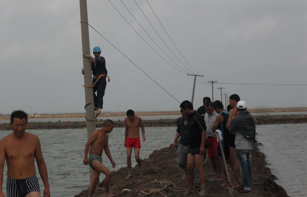 8月2日21時30分,“達維”在鹽城陳家港鎮登陸,帶來狂風暴雨。所轄供電范圍比鄰陳家港鎮,臺風造成電力設施損壞,多條10KV線路停電。該所啟動重大氣象災害應急預案,全所職工在崗待命搶修, 8月3日凌晨3時30分有全部到崗工作。4時,職工分頭對線路進行巡視檢查,在第一時間發現故障點,以便搶修。該所主要領導主動與重要客戶聯系,及時掌握情況,組織人員搶修。廣大搶修職工不怕困難,不怕疲勞連續作戰,盡快恢復和保證生產生活用電,發揮了供電人特別能戰斗的精神。由于電桿倒在水中,給立桿帶來了困難,大家主動脫去衣服,跳入到半腰身的水中搶修,有的解線,有的打拉線,個個干得一身汗,一身泥。