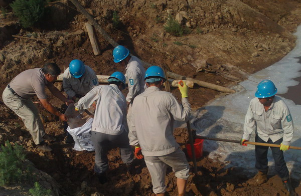 職工在準備防汛泥袋