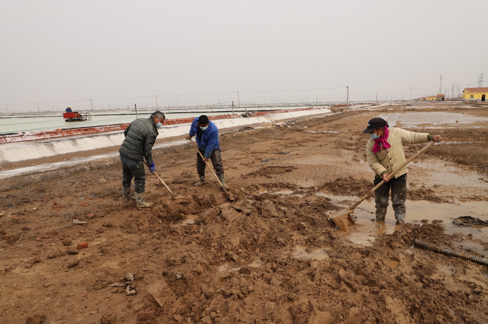 328日清晨,在通往日曬制鹽新河、埒南分公司入口處,戴著口罩的工人們依次接受測溫、亮碼、登記,有序進入各生產班組。灘頭上,工人們分散作業,忙著修補塑造、整理廩基……無論是從灘頭到塘頭,還是從碼頭到田頭,處處都呈現出熱火朝天、大干快上的場景。