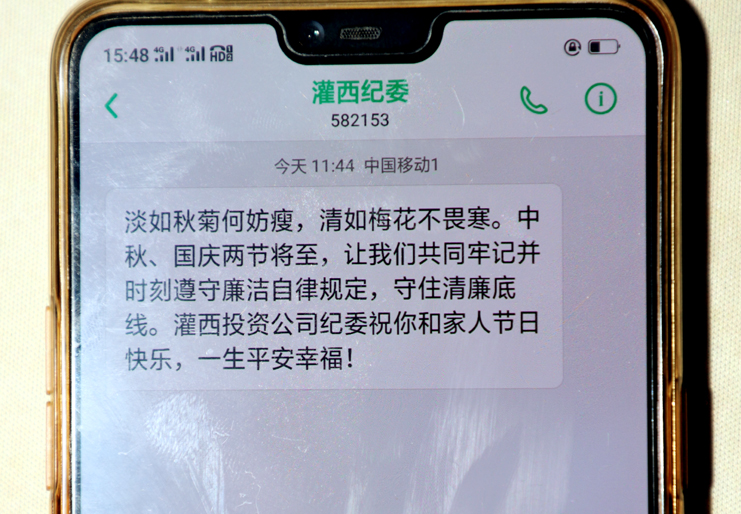 群發一條廉政提醒短信。以“灌西紀委”名義向全公司黨員干部普發“廉政短信”。向黨員領導發送廉政短信‘拉袖子 、敲警鐘’,以提醒黨員干部“嚴格執行廉潔從政各項規定,‘反四風’、樹新風,廉潔文明過佳節”,不僅提醒黨員干部做好廉潔帶頭人,更重要的是提醒廣大領導干部要牢記黨風廉政建設兩個責任,在落實責任上要有主動擔當!