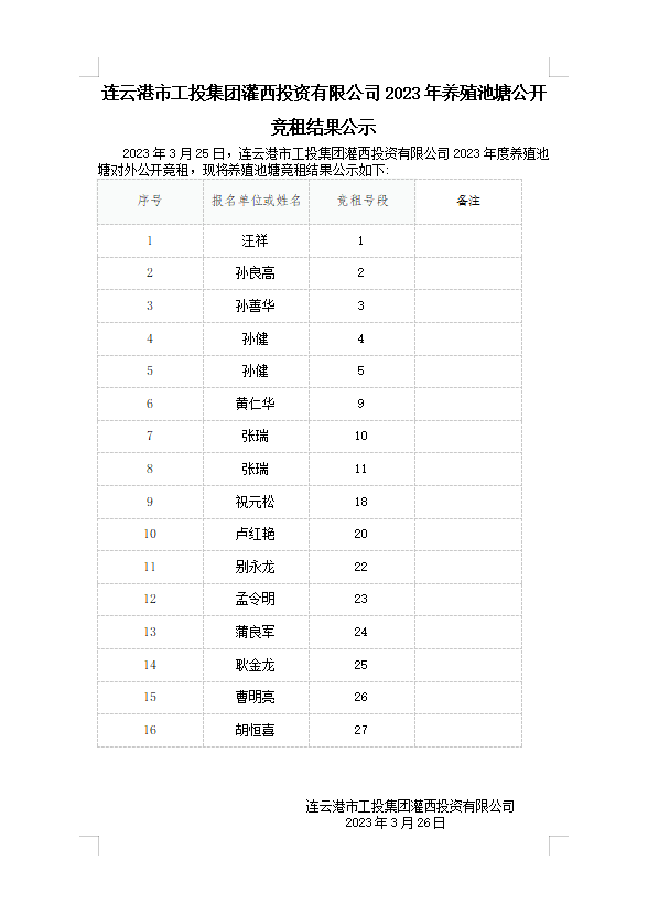 連云港市工投集團灌西投資有限公司2023年養殖池塘公開競租結果公示