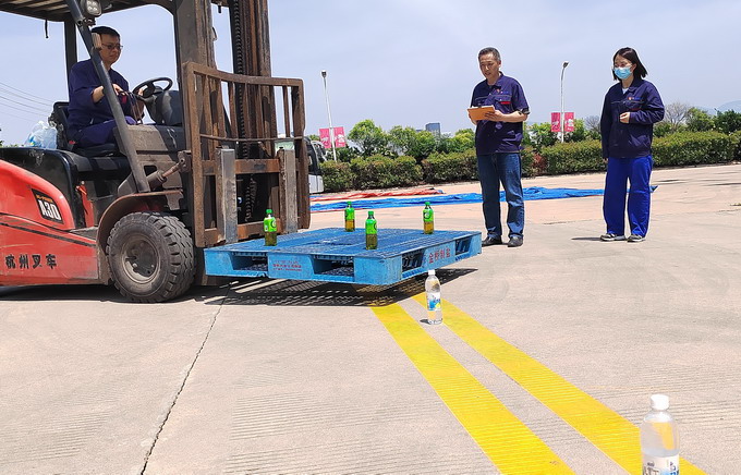 比“四平八穩”。叉車繞樁賽設計了5個的急轉彎彎道,主要考核對叉車轉彎角度的把握程度及操作的平穩性,極大地考驗了選手的行駛技能。比賽現場精彩紛呈,選手們專注投入、熟練操控,充分展示選手扎實的基本功和熟練的操作技巧。