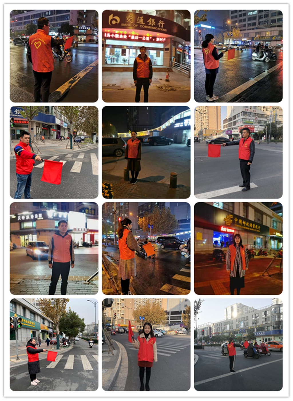 下午530分,天色已漸漸的暗淡下來,但青年志愿者們并沒有缺席或早退,天空忽然下起了雨,穿著紅馬甲的青年志愿者在路燈的映襯下,與飄斜的細雨形成一道亮麗的風景線。