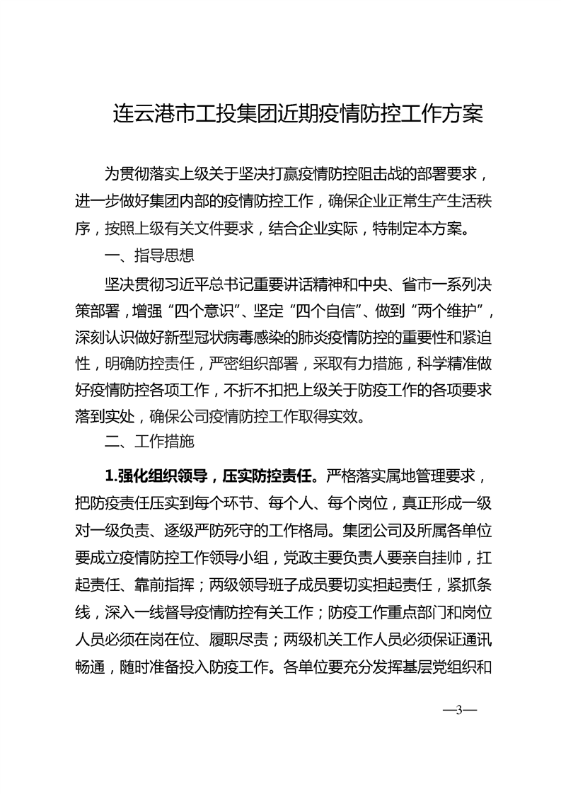 《連云港市工投集團近期疫情防控工作方案》的通知