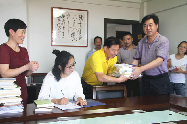 8月16日上午,青口投資公司機關支部舉行圖書捐贈活動,公司董事長、黨委書記胡傳法帶頭捐贈圖書十二本。
