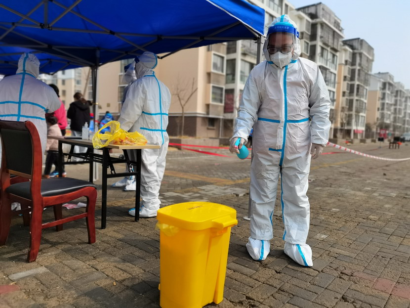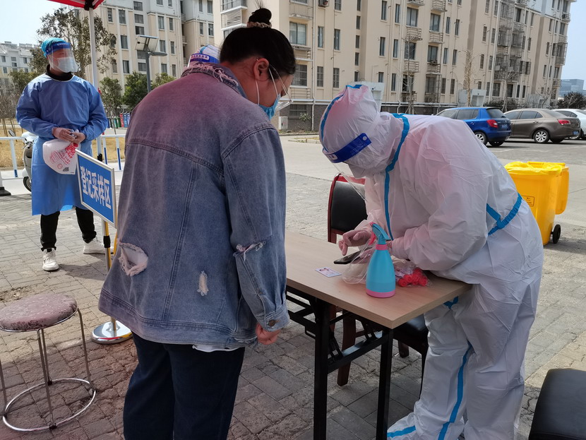 清晨630分,1號檢測點,李明同志在檢查物資,“大白”服裝4套、“小藍”服裝6套、棉簽600根……;2號檢測點,于洪亮在將物資上桌,病毒核酸檢測試管、棉簽、消毒液,“還缺少一瓶酒精,我立即反饋給社區,請社區抓緊安排送來”;4號檢測點,蘇玲、秦黎明正在互相幫忙穿好防護服,“秦姐,這個防護面罩里外有兩層薄膜,我給你撕掉,這樣就不會有霧氣了”,“嗯嗯,你這個拉鏈得拉到頂,我們自己也一定要做好防護”秦黎明溫柔的說;5號檢測點,內退黨員孫芳和姜海洋,互相在防護服后背寫上對方的名字,以便于更高效的完成檢測工作;6號檢測點,霍正鋼、朱文健、韓永剛、邱榮濱正在清點檢測小卡片;7號檢測點,張強在拿著酒精給廢物處置垃圾箱消毒;8號檢測點,新加入的孫銀、占恒春、尹永明、韓永光、趙紹慶正在給消殺噴霧劑灌裝84消毒液,社區8個檢測點的消殺工作全部由昌圩臨時黨支部志愿者負責。