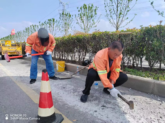 228省道西側,班長姚功巡查發現,有近50多米長混凝土攪伴拋灑主干道路面,如不及時處理,嚴重影響路面行車安全。班長姚功及時召集隊員,馬不停蹄趕赴道路現場。上午10時左右,室外氣溫已經直逼35℃,大家顧不上天氣的炎熱,揮動手中鐵錘,不停地震動路面“凍結”已久的水泥,黨員胡可貴與同事徐育軍、伏彩林主動參戰,交替使用手中的撬棍,盡管汗水浸透橙色衣衫,雙手磨出了血泡,大家也沒有叫苦叫累,經過近三個多小的努力奮戰,終于恢復原有黑色柏油路面。